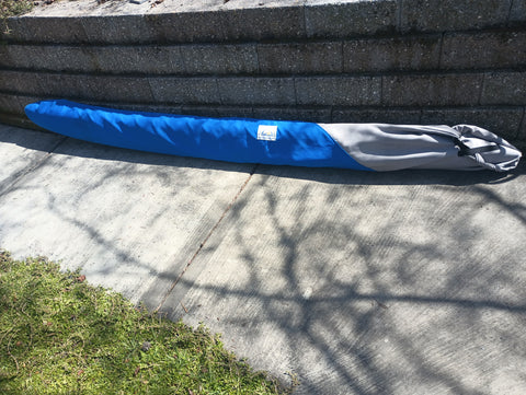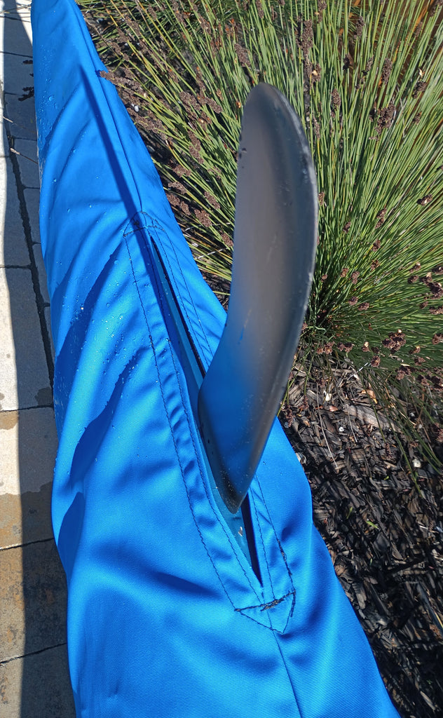 Canoe covers include big #10 YKK Delrin zippers to prevent sieze up due to salt and time. The molded tooth zippers we use are desinged for marine use and are UV and corrosion resistant. Rudder slots and other areas are reinforced with webbing to protect potential wear and stress points on the cover.